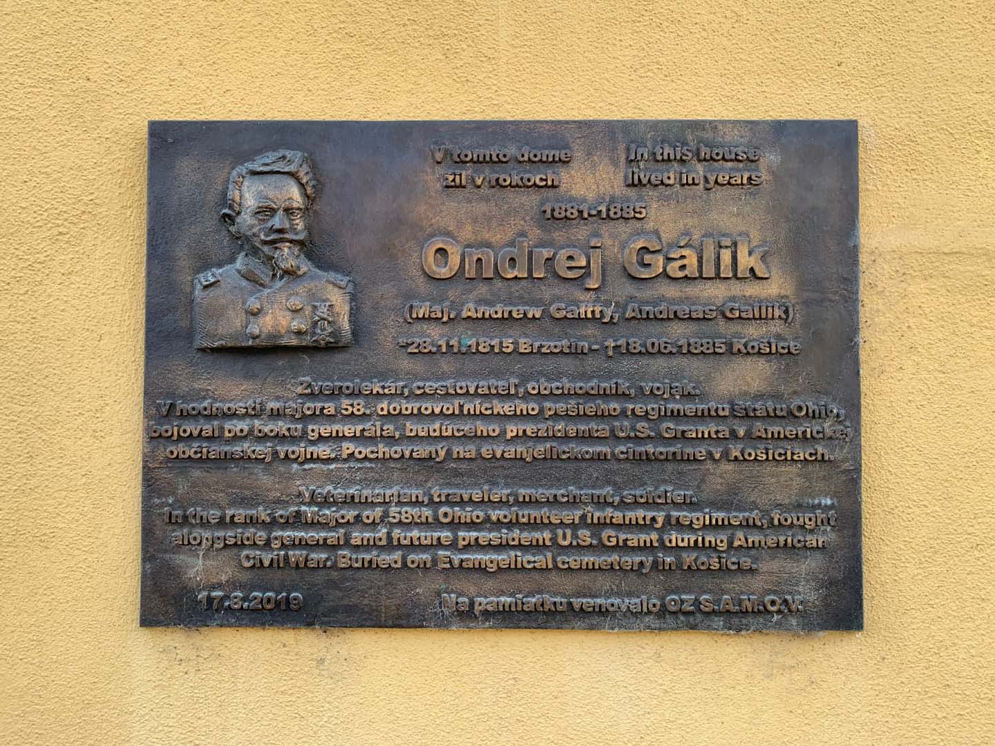 On the outside wall of the building is a plaque commemorating Ondrej Gálik who was a Slovak-American Civil War officer served in the Union Army during the American Civil War.