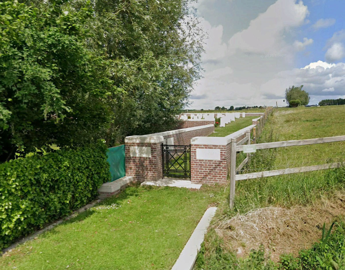 The R.E. Farm Cemetery is a CWGC cemetery and is situated on the southeast outskirts of Heuvelland, about 4.5 km from the town hall. The cemetery is located about 450 meters northeast of Wulvergemstraat and Vrooilandstraat intersection.
