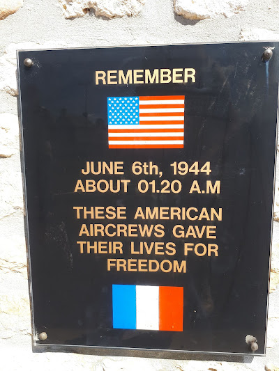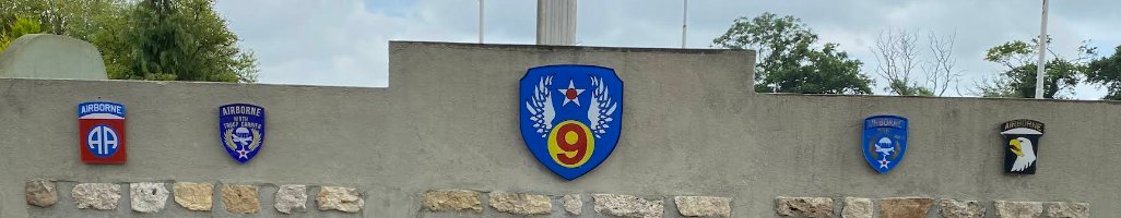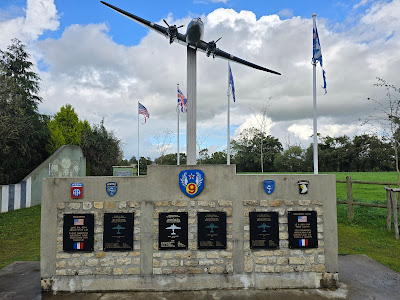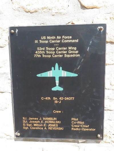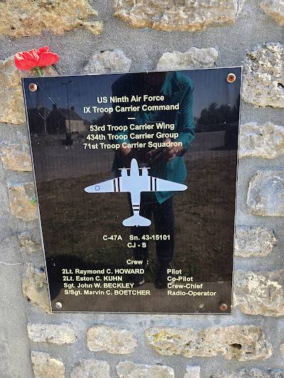 MonumentThe monument honors the crews of the IX Troop Carrier Command of the U.S. Ninth Air Force who transported American paratroopers during the D-Day airborne operations of Operation Overlord on the night of 56 June 1944, commemorating several C-47 Skytrain aircraft shot down by German anti-aircraft fire near Picauville and remembering the paratroopers and airmen who were killed. The monument consists of a stone and concrete memorial wall with several black commemorative plaques dedicated to the fallen aircrew and paratroopers. At the center of the wall are the insignia of the U.S. 82nd and 101st Airborne Divisions, Airborne Troop Carrier units, IX Troop Carrier Command, and the Ninth Air Force. Behind the wall stands a large elevated replica of a C-47 Skytrain mounted on a tall pedestal, symbolizing the transport aircraft used in the airborne assault.