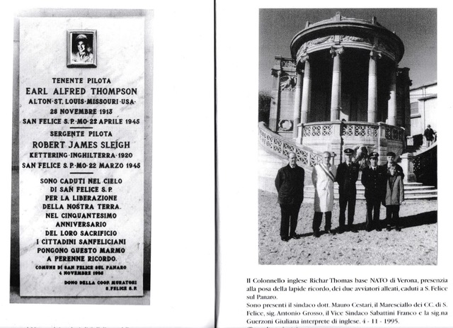 A white inscribed plaque remembering 1LT Thompson and a British Pilot who were killed near San Felice sul Panaro while flying missions. The plaque is found in the town Monument and Mausoleum for 86 dead from World War I and a few from World War 2. The plaque also includes the name of a British flyer who also died near San Felice.