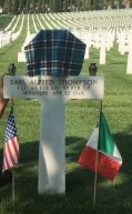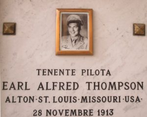 Per Missing Aircraft Report (MACR) 14076: On April 22, 1945 1LT Earl A. Thompson of the 65th Fighter Squadron, 57th Fighter Group, flying a P-47D (44-20118) “My Naked Ass” was flying an armed reconnaissance mission near the north bomb line in Italy. Taking off from a base in Grosseto, Italy, 1LT Thompson crashed at 13:15 while strafing enemy targets near via Vallicelletta, San Felice sul Panaro. 1LT Thompson was temporarily interned in the town World War I monument for the fallen. He now rests in the Florence American Cemetery. The town placed a plaque remembering 1LT Thompsons’ and a British pilot on the 50th anniversary of their sacrifice.