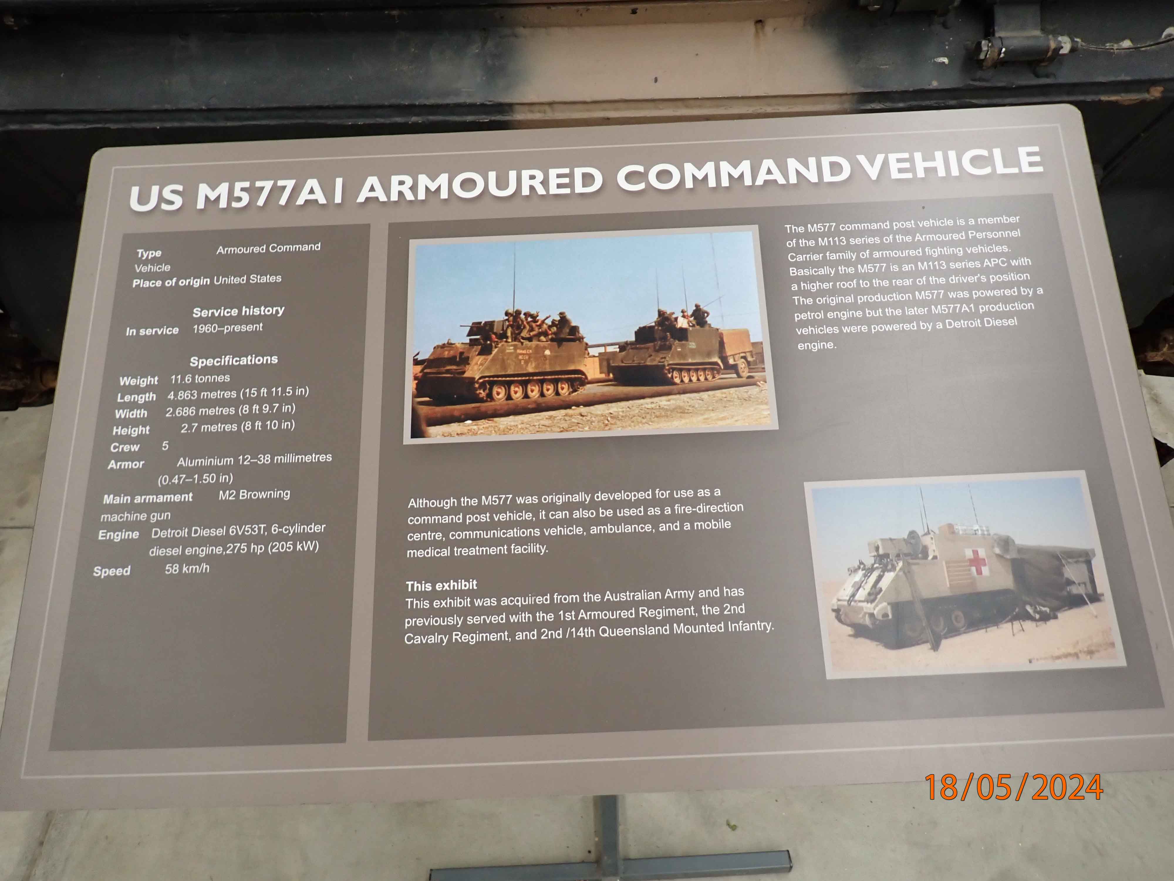 The M577 command post vehicle is a variant of the M113 armored personnel carrier, featuring a higher rear roof behind the driver's position.