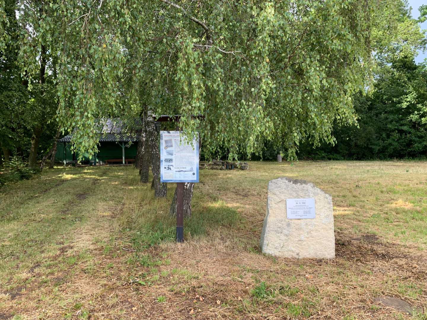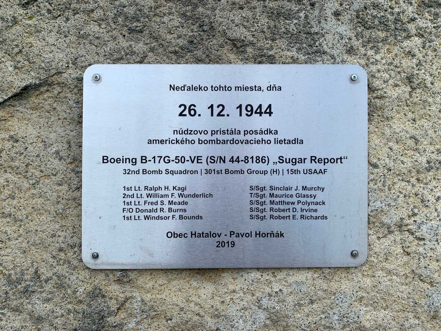 A roughly hewn stone monument with a rectangular plaque at its center commemorating the crew of B-17G #44-8186, nicknamed Sugar Report, who made an emergency landing near this site on December 26, 1944. The plaque, written in Slovak and English, lists the names and ranks of the crew members and was installed on November 21, 2019, by the village of Hatalov and Pavol Hornák.