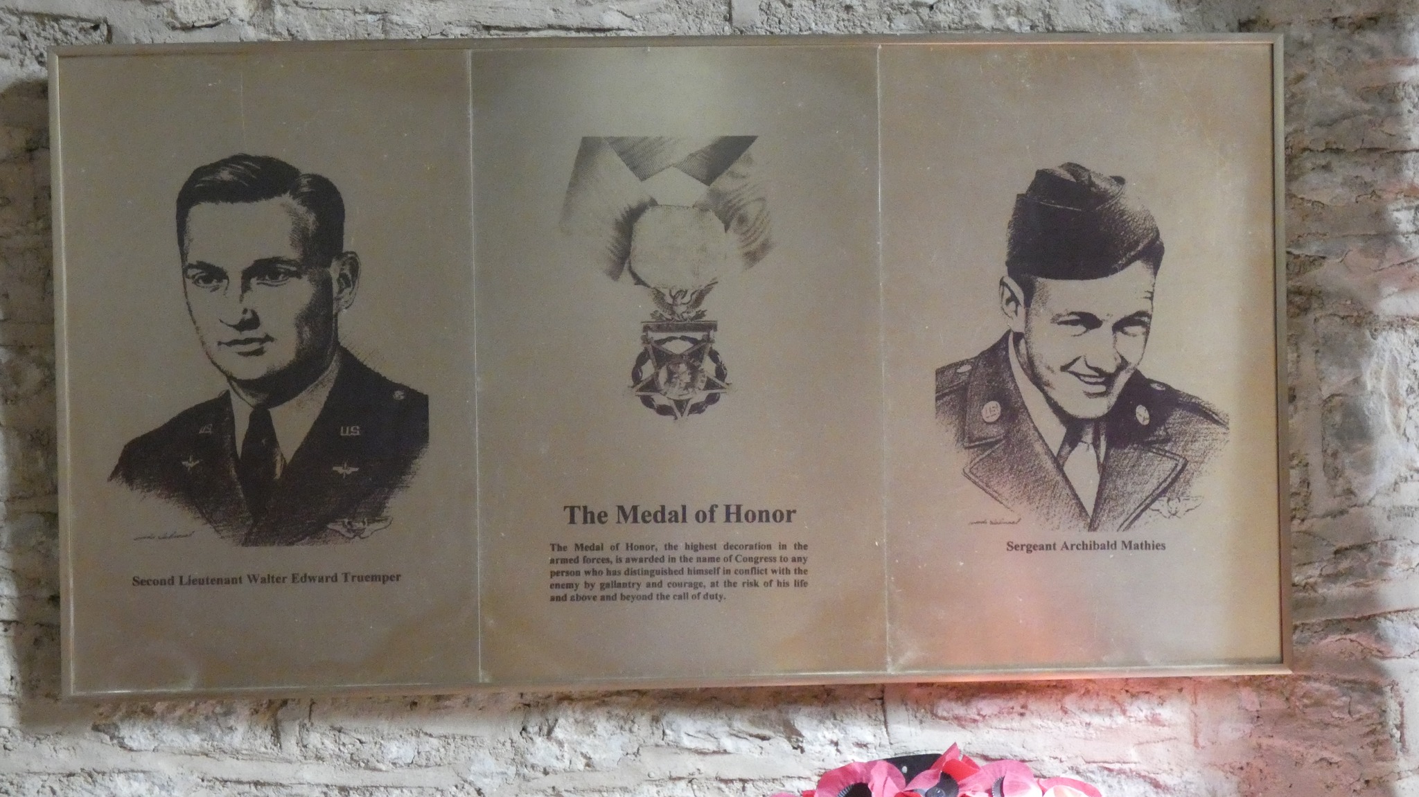 On February 20th 1944 the Flying Fortress, Ten Horsepower, was sent with the 510th Bomber Squadron on a bombing raid to Leipzig in Germany as part of the "big Week" . When the plane was attacked by German fighter aircraft, the Co-Pilot was killed instantly and the Pilot, Captain Clarence Nelson severely wounded and unconscious. 'Ten Horsepower' was spiralling out of control until the Navigator, Lt Walter Truemper, assisted by SSG Archie Mathies (born in Scotland), though unqualified to pilot a plane, took charge. Still under bombardment and with their plane crippled, they limped back to Polebrook. They refused to bail out with the other living crew members because they felt unable to leave the severely injured Captain Nelson to his fate. The Base Commander, Col. Eugene Romig, and Major Ledoux took off in another plane to try fly alongside them to try to ensure a safe landing. Several attempts proved futile. They deliberately avoided further damage to personnel and planes on the ground by heading for an open field where they ploughed into Denton Hill. Walter Truemper and Archie Mathies died instantly: Their outstanding courage is hereby recognised. Both Mathies and Truemper were honored posthumously with the Medal of Honor for their heroic efforts.