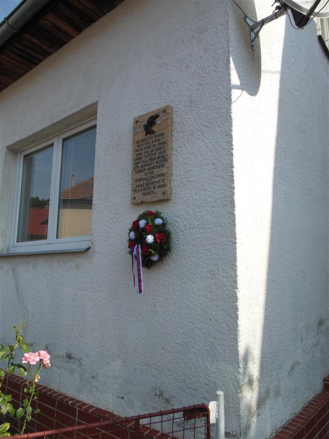 IN MEMORY OF THE PEÁTOV FAMILY, WHO HID THE AMERICAN AIRMAN JOSEPH E. SALLINGS FROM THE GERMAN OCCUPANTS IN THIS HOUSE FROM AUGUST 1944 UNTIL THE END OF THE SECOND WORLD WAR...TRUE HEROISM IS THAT WHICH NO ONE KNOWS ABOUT...