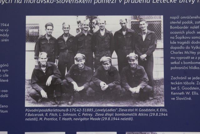 The monument remembers the crews of B-17 (42-31885) 'Lovely Ladies' & B-17 (42-31473) of the 20th Bomber Squadron, 2nd Bomber Group, 15th US Air Force, which were shot down on August 29, 1944, during "Mission 263". Fifteen of the crew were killed in action, and five were taken as POWs during this "Air Battle over the White Carpathians".
