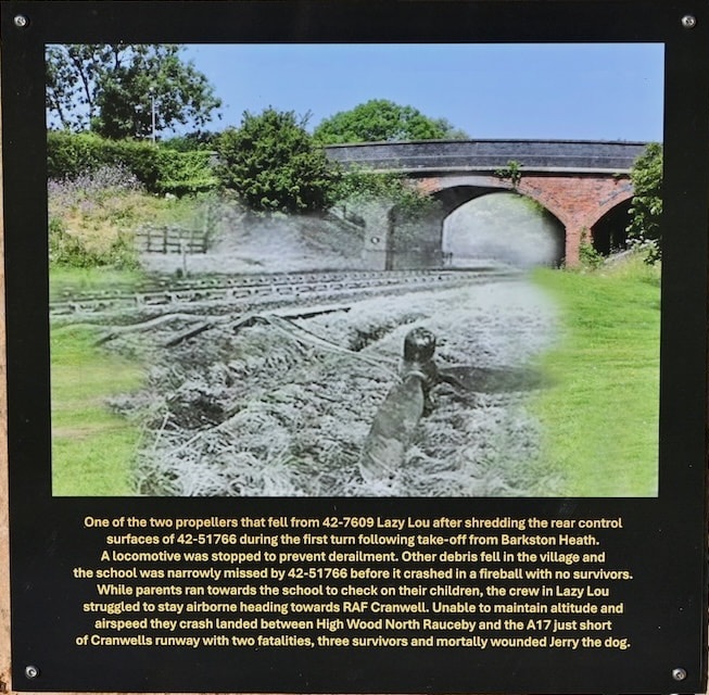 One of the two propellers that fell from 42-7609 Lazy Lou after shredding the rear control surfaces of 42-51766 during the first turn following take-off from Barkston Heath. A locomotive was stopped to prevent derailment. Other debris fell in the village and the school was narrowly missed by 42-51766 before it crashed in a fireball with no survivors. While parents ran towards the school to check on their children, the crew in Lazy Lou struggled to stay airborne heading towards RAF Cranwell. Unable to maintain altitude and airspeed they crash landed between High Wood North Rauceby and the A17 just short of Cranwells runway with two fatalities, three survivors and mortally wounded Jerry the dog.