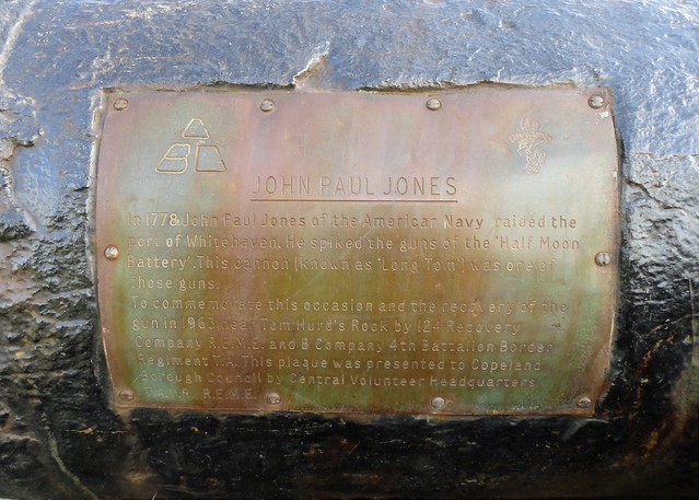 In 1778 John Paul Jones of the American Navy raided the port of Whitehaven. He spiked the guns of the Half Moon Battery This cannon (known as Long Tom) was one of these guns. To commemorate this occasion and the recovery of the gun in 1963 near Tom Hurds Rock by 124 Recovery Company R.E.M.E. and B Company 4th Battalion Border Regiment T.A. This plaque was presented to Copeland Borough Council by Central Volunteer Headquarters