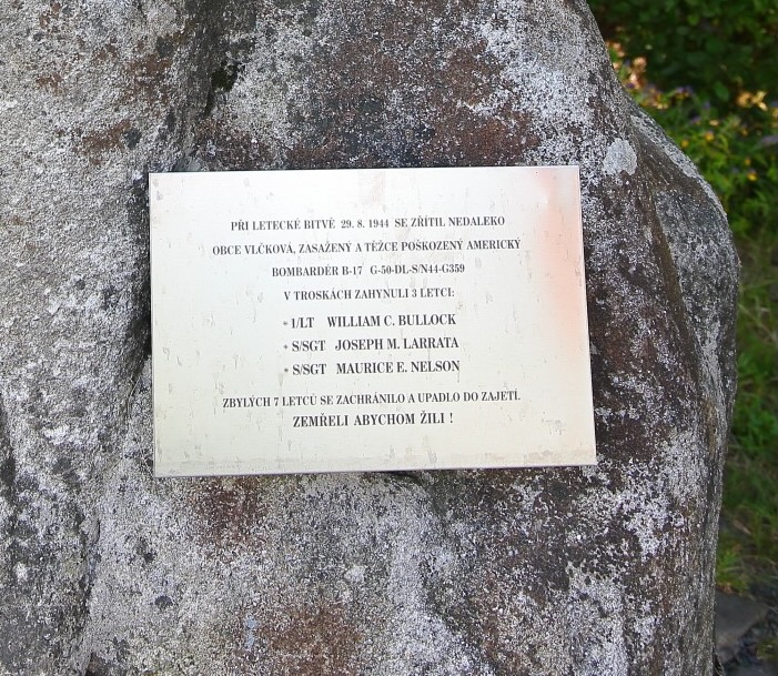 DURING AN AIR BATTLE ON 29. 8. 1944, AN AMERICAN BOMBARDER B-17 G-50-DL-S/N44-G 359 CRASHED NEAR THE VILLAGE OF VLÉKOVA, WAS HIT AND HEAVILY DAMAGED