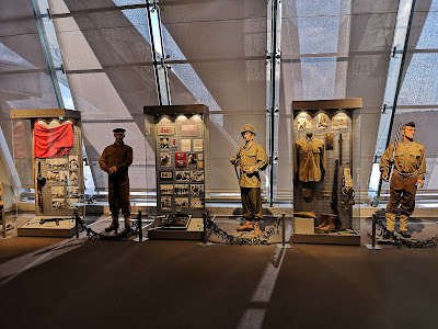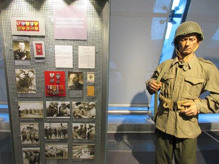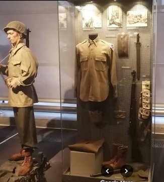 Commemorative ObjectIn the center of the hall, mannequins dressed in Soviet, British, U.S., and Free French World War II uniforms stand as symbols of unity among the Allied nations. Surrounding them are display cases filled with photographs and authentic military artifacts, illustrating the combined efforts of the United States, Soviet Union, United Kingdom, Poland, and France in the fight against Nazi Germany. Among the exhibits is a World War IIera U.S. Army infantry captains uniform shirt bearing the 69th Infantry Division patch, displayed with an M1 Garand rifle, bayonet, ammunition pouches, canteen, and entrenching tool items representing the bravery and discipline of the American soldier.