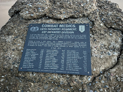 PlaqueA rectangular black plaque is mounted on a large natural boulder on Omaha Beach (known as Rays Rock), commemorating the Combat Medics of the 16th Infantry Regiment, 1st Infantry Division, who treated the wounded under heavy fire during the D-Day landings on June 6, 1944. It features a combat medic insignia and the divisions Big Red One emblem, followed by a bilingual dedication in English and French. Below, the names, ranks, and roles of medics from the regiments 2nd Battalion are listed, with crosses indicating those killed in action.