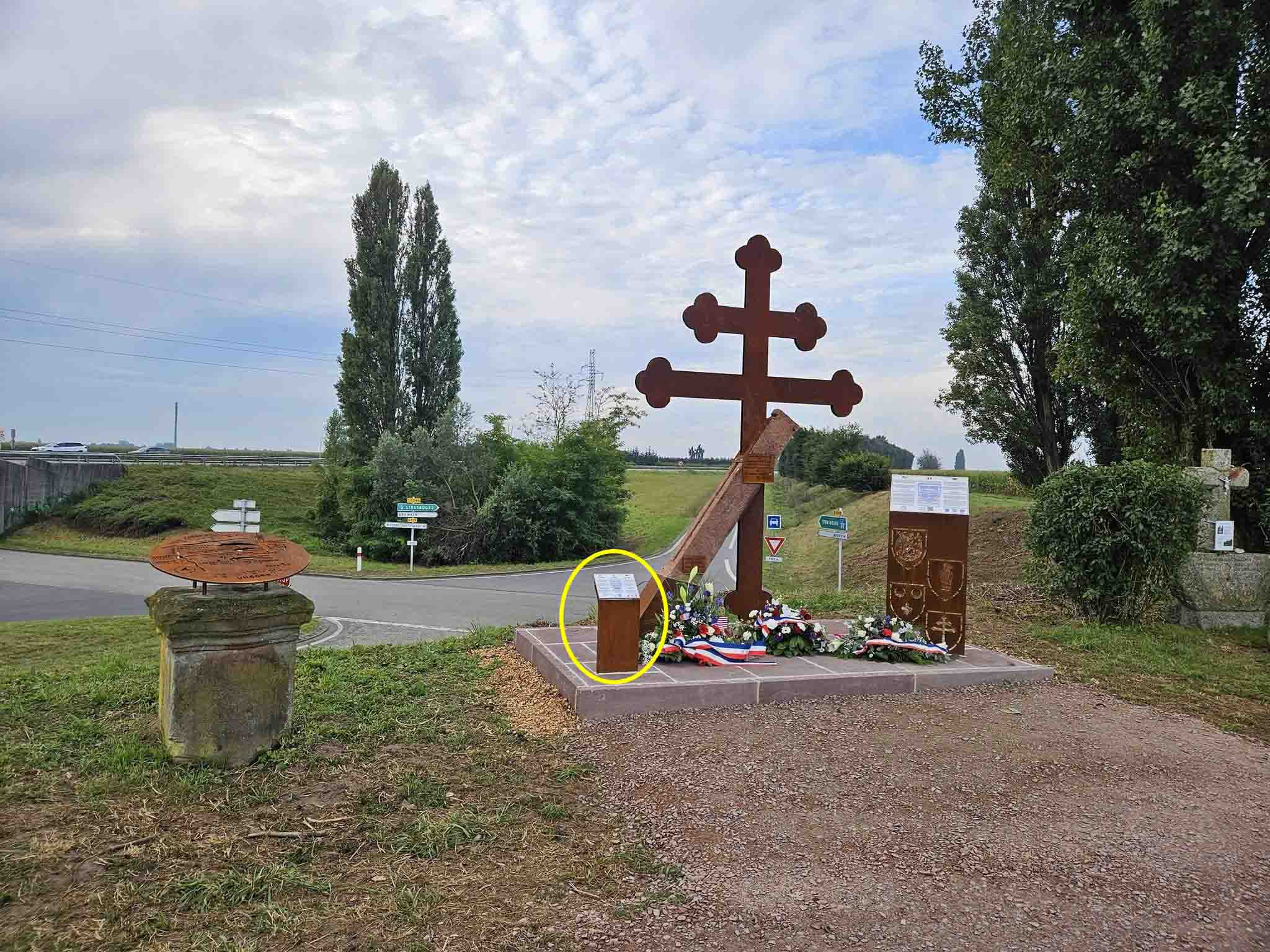 DELIVRANCE* A word from the Artist: To me, this sandstone block represents Alsace defeated by Nazi troops advancing from the East. Supported and shouldered by the cross of the 79th American Infantry Division coming from the West, Alsace fought to repel the German army and liberate our homeland. These combined forces shed blood and tears for our freedom! It is our duty to keep these memories alive, and thus, this monument stands here, in this place, ensuring that this memory never fades into oblivion! David ROEHLLY Sculptor artist