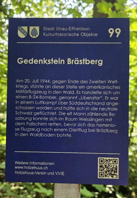 The memorial remembers the B-24 (42-51132) of the 739th Bomber Squadron, 454th Bomber Group, 15th US Air Force that crashed here on July 20, 1944. The aircraft flying from the San Giovanni Airfield in Southern Italy was on a mission to bomb the Maybach Complex in Germany. On the return flight, the plane was hit by flak over Friedershaven, Germany. The crew bailed out over Switzerland and survived; the plane crashed on this hill known at Prestberg (Brastberg). The crew became Swiss Internees and one of the crew, Captain John Trautner, was reported to have escaped and returned to duty during the war.