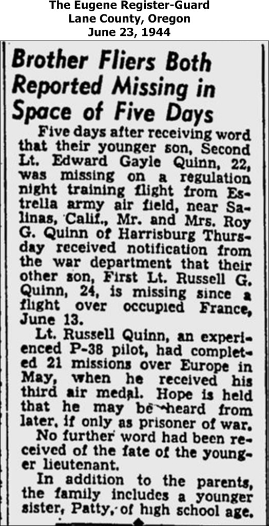 A small wing-like vertical stone monument with gold lettering commemorating Lt Russel Quinn in both French and English. LT Quinn served in the 77th Fighter Squadron, 20th Fighter Group and was KIA on June 13, 1944 while piloting P-38 Lightning 44-23174. His brother, LT Edward Gale Quinn was killed a few days later in a flight training accident in California.