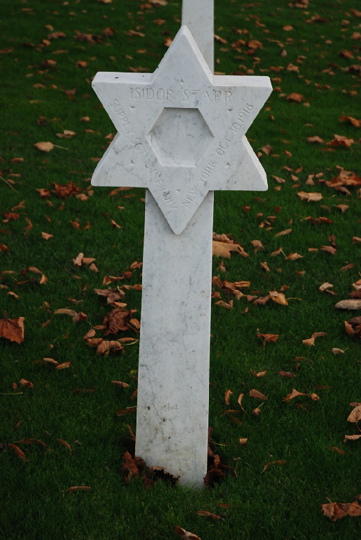 When Isidor Starr was born on December 23, 1894, his father, Hyman, was 28 and his mother, Ida, was 29. He entered the military service in New York and served in the U.S. Army during World War I as a Supply Sergeant in Company D, 18th Infantry Regiment, 1st Infantry Division. He was Killed in Action on October 10, 1918 and is now buried in Meuse-Argonne American Cemetery and Memorial, Romagne-sous-Montfaucon, Departement de la Meuse, Lorraine, France. His name is commemorated on the First Infantry Division monument in Saint-Juvin, France and ranked as a Private.