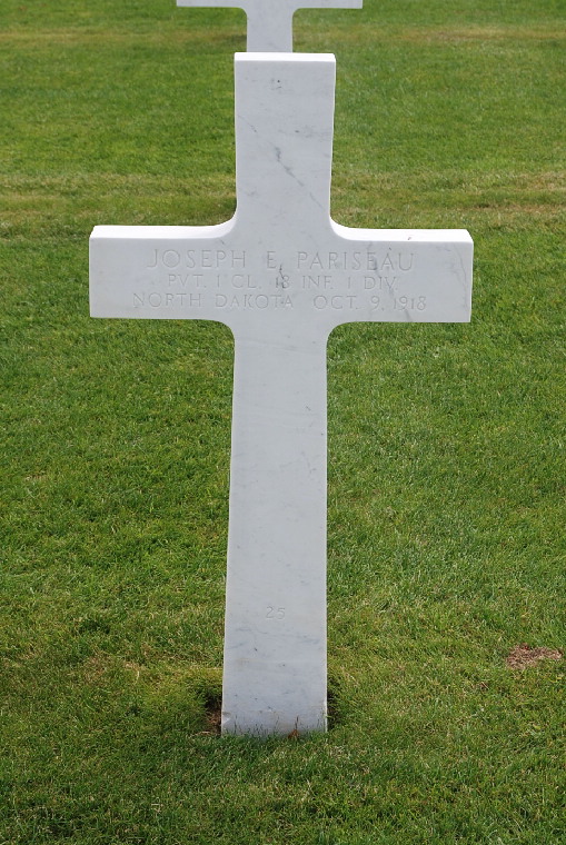 When Joseph E. Pariseau was born in 1898 in North Dakota, his father, Joseph, was 40 and his mother, Julia, was 28. he served in the U.S. Army during World War I as a Private First Class in Company E, 18th Infantry Regiment, 1st Infantry Division. He was Killed in Action on October 9, 1918 and is now buried in Meuse-Argonne American Cemetery and Memorial, Romagne-sous-Montfaucon, Departement de la Meuse, Lorraine, France. His name is commemorated on the First Infantry Division monument in Saint-Juvin, France and ranked as a Private.