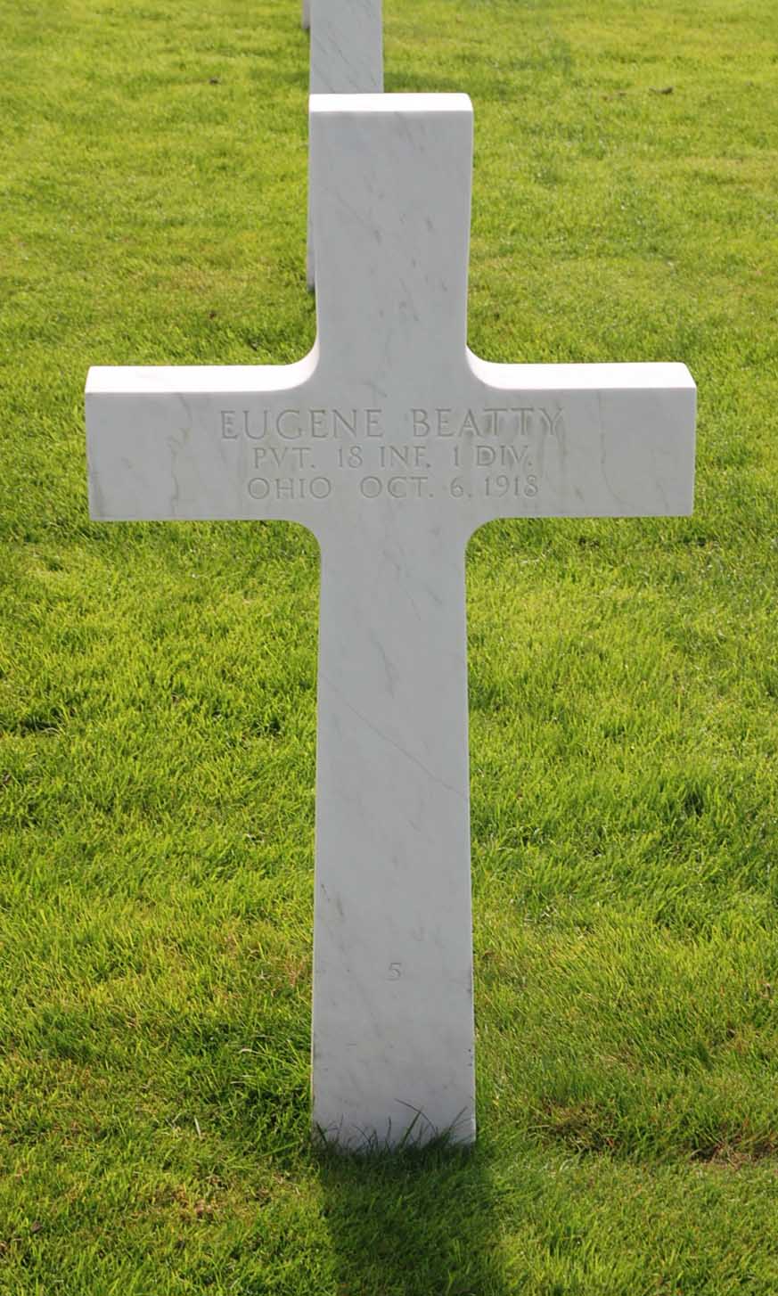 When Eugene E. Beatty was born on July 17, 1891, his father, Robert, was 30 and his mother, Idell, was 29. He had one brother. He entered the military service in Ohio and served in the U.S. Army during World War I as a Private in Company G, 18th Infantry Regiment, 1st Infantry Division. He died from his wounds received in battle on October 6, 1918 and is now buried in Meuse-Argonne American Cemetery and Memorial, Romagne-sous-Montfaucon, Departement de la Meuse, Lorraine, France.