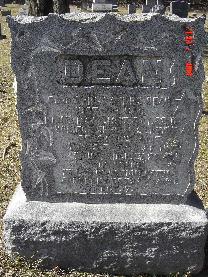 Percy A. Dean was born in 1897. He enlisted in the Army on May 1, 1917 and was assigned to Company I, 22nd Infantry. He served in the U.S. Army during World War I as a Corporal in Company L, 26th Infantry Regiment, 1st Infantry Division. He was Killed in Action on October 7, 1918 at Argonne Forest in France and is now buried in Glenwood Cemetery, Oneida, Madison County, New York, USA.