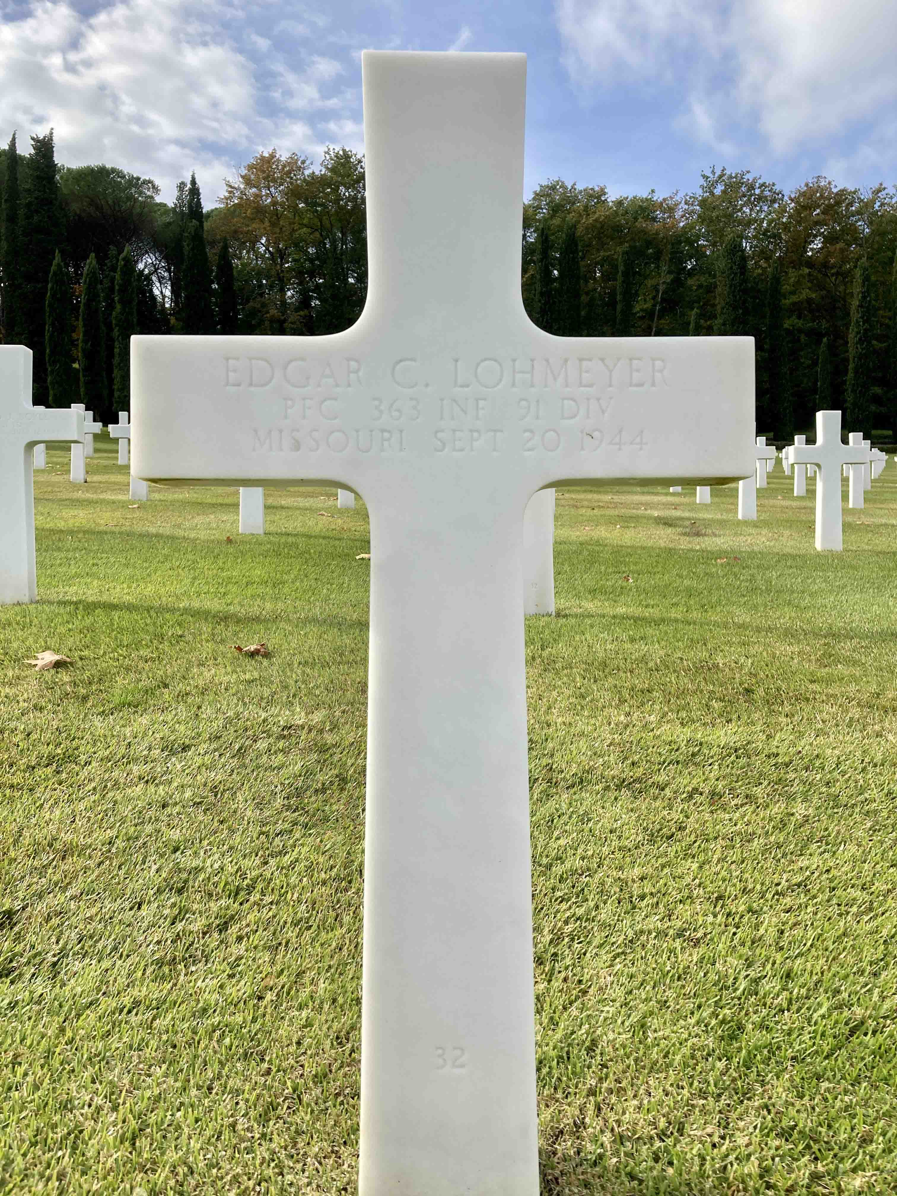 Edgar C. Lohmeyer entered the military service in Missouri. He served in the 363rd Infantry, 91st Infantry Division as a Private First Class during World War II. Edgar died on September 20, 1944 during the battle in the area of Ponzalla in Italy and is now buried in the Florence American Cemetery, Impruneta, Italy.
