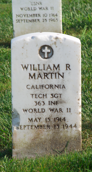 William R. Martin, aged 30, was born on May 15, 1914. He served in the 363rd Infantry, 91st Infantry Division as a Technical Sergeant during World War II. William died on September 13, 1944 during the battle in the area of Ponzalla in Italy and is now buried in the Golden Gate National Cemetery, San Bruno, San Mateo County, California, USA.