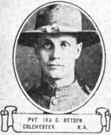 Ira Galord Betson was born on August 10, 1886 in Colchester, McDonough County, Illinois. He served in the U.S. Army during World War I as a Private in Company A, 26th Infantry Regiment, 1st Infantry Division. He was Killed in Action on October 6, 1918 and is now buried in Mount Auburn Cemetery, Colchester, McDonough County, Illinois, USA.