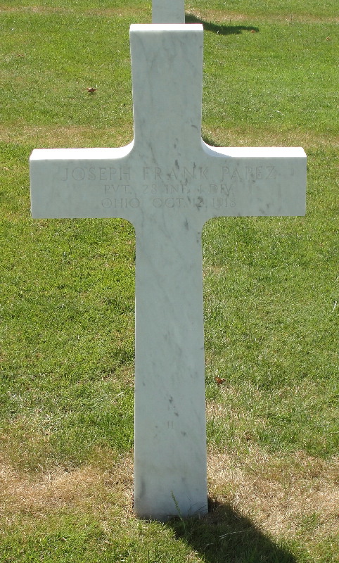 Joseph Frank Papez entered the military service in Ohio. He served in the U.S. Army during World War I as a Private in Company K, 28th Infantry Regiment, 1st Infantry Division. He was Killed in Action on October 12, 1918 and is now buried in Meuse-Argonne American Cemetery and Memorial, Romagne-sous-Montfaucon, Departement de la Meuse, Lorraine, France.