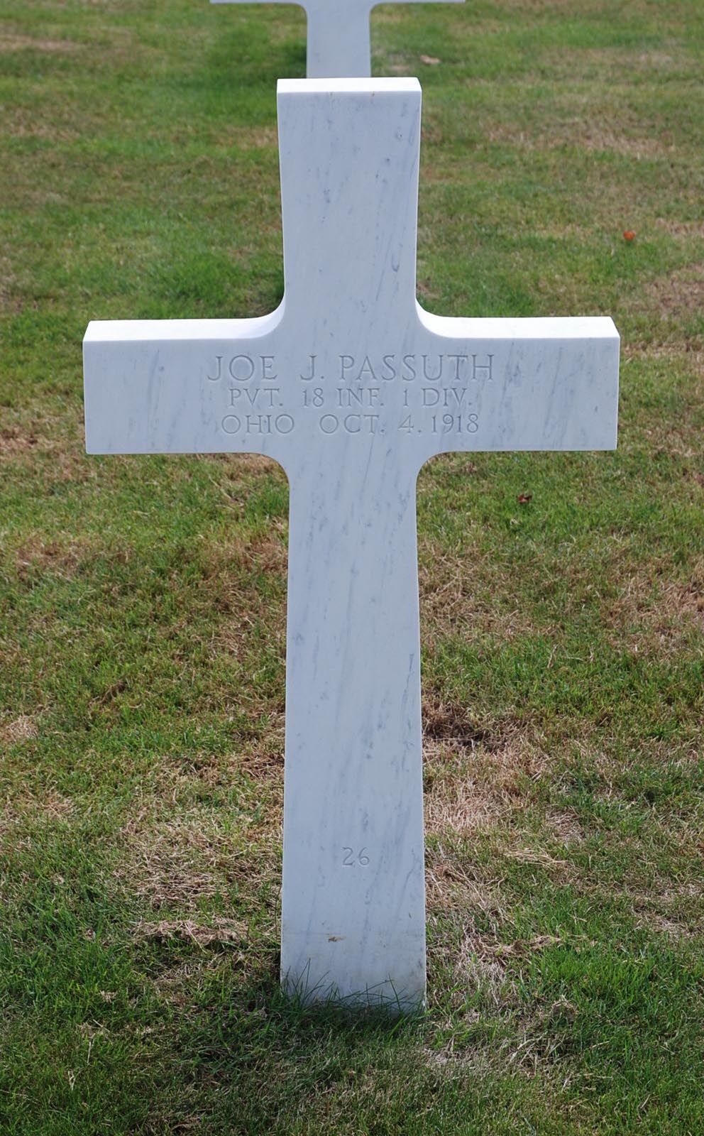 Joe J. Passuth entered the military service in Ohio. He served in the U.S. Army during World War I as a Private in Company L, 18th Infantry Regiment, 1st Infantry Division. He died on October 4, 1918 and is now buried in Meuse-Argonne American Cemetery and Memorial, Romagne-sous-Montfaucon, Departement de la Meuse, Lorraine, France. His name is commemorated on the First Infantry Division monument in St. Juvin, France under the MISSING IN ACTION section.
