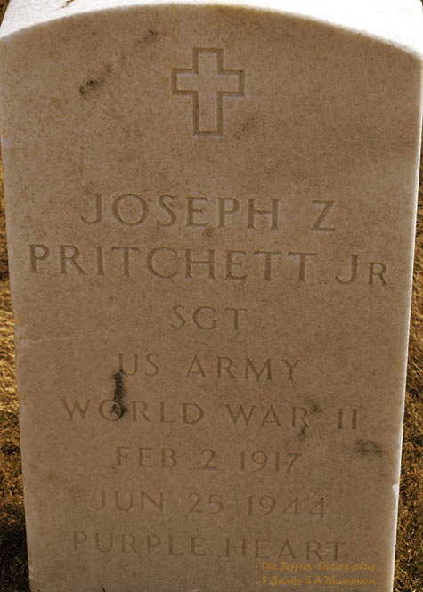 Joseph Z. Pritchett, Jr. was born on February 2, 1917, son of Mr. and Mrs. Joe Pritchett. He was an employee of Firestone Tire and Rubber Co. before volunteering for the Army. He had served with Gen. Mark Clark's Fifth Army in the Battles for Tunisia and Sicily, and was sent to England for a rest four months before the invasion. He was Killed in Action on June 25, 1944 at the age of 27 and is now buried in Marietta National Cemetery, Marietta, Cobb County, Georgia, USA.