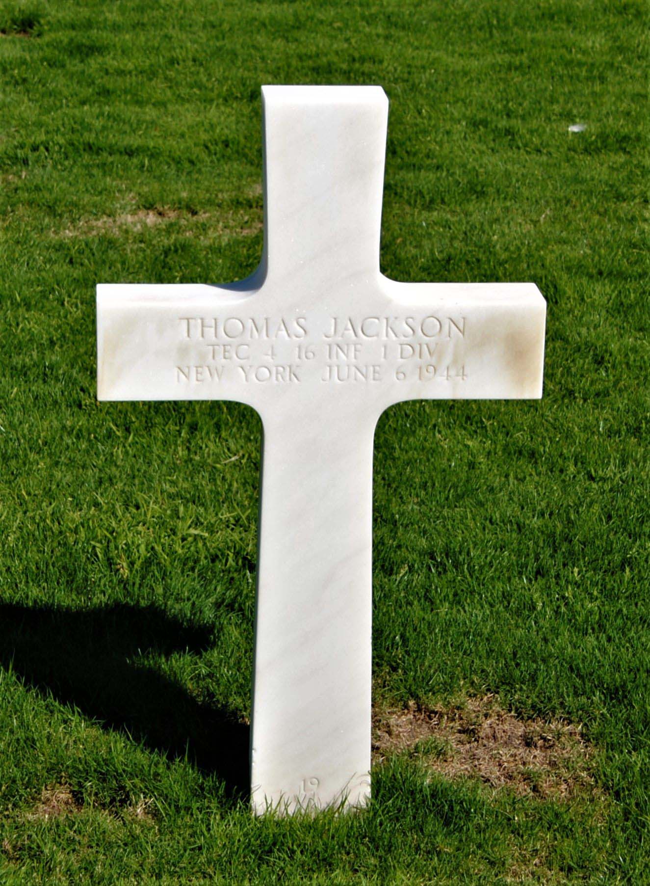 Thomas Jackson was born in 1920 in Pennsylvania. He enlisted in the Army on January 16, 1942 at Fort Niagara, Youngstown, New York. He was noted, at the time of his enlistment, as being Single, without dependents. He resided in Erie County, New York prior to the war. Thomas served in the U.S. Army during World War II as a Technician Fourth Grade and a combat medic in the 16th Infantry Regiment, 1st Infantry Division. He was Killed in Action on June 6, 1944 during the invasion on Omaha Beach, France and is now buried in Normandy American Cemetery, Colleville-sur-Mer, France. His name is commemorated on the First Infantry monument and plaque in Ray's Rock in Omaha Beach, France and ranked as a Sergeant.