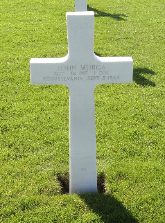 John Murga entered the military service in Pennsylvania. He served in the U.S. Army during World War II as a Sergeant in the 18th Infantry Regiment, 1st Infantry Division. He died on September 5, 1944 and is now buried in Henri-Chapelle American Cemetery, Hombourg, Belgium.