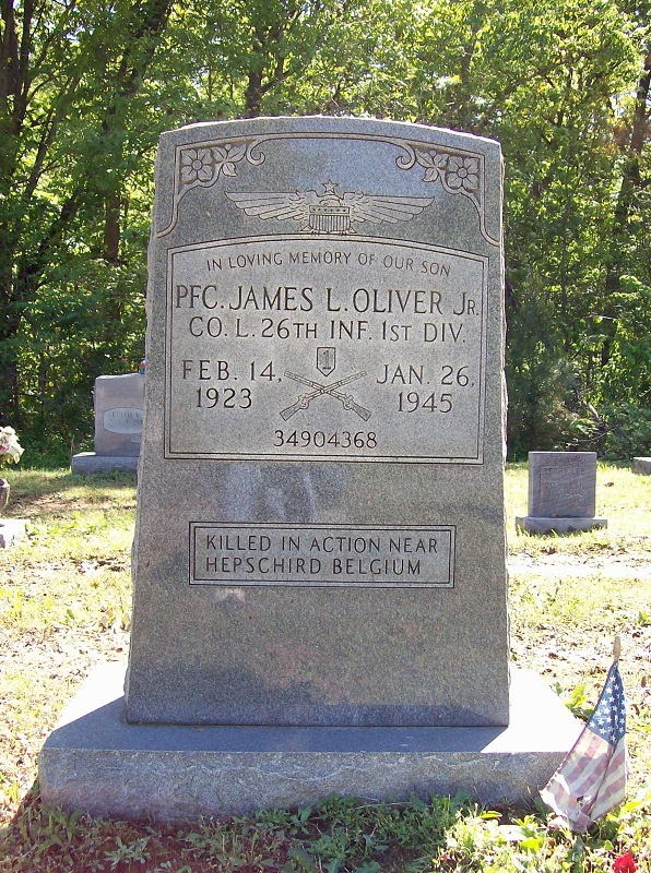 James L. Oliver, Jr. was born on February 14, 1923. He was the son of James Lilburn Oliver and Clara Hayes Oliver. James served in the U.S. Army during World War II as a Private First Class in Company L, 26th Infantry Regiment, 1st Infantry Division. He was Killed in Action on January 26, 1945 near Hepschird, Belgium at the age of 21 and is now buried in Mount Zion Church of Christ Cemetery, Paris, Henry County, Tennessee, USA.