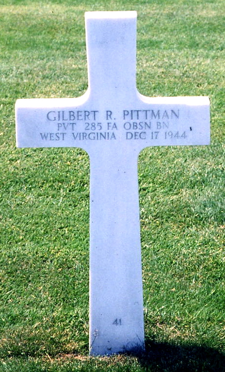 Gilbert Ray Pittman was born on October 9, 1922 in Charleston, West Virginia. He served in Battery B, 285th Field Artillery Observation Battalion as a Private during World War II. He was Killed in Action on December 17, 1944 at the age of 22 and is now buried in the Henri-Chapelle American Cemetery, Hombourg, Belgium. PVT Pittman was one of the victims of Malmedy massacre when German SS soldiers of the 1st Panzer Division captured over 100 American soldiers at Baugnez Crossroads outside Malmedy, Belgium, on 17 December 1944 during the Battle of the Bulge and, under orders to take no prisoners, placed them in an open field and then machine gunned them. When the machine guns stopped, the SS went through the field where some victims were still alive and systematically finished them off with pistols at short range leaving 84 soldiers dead when they had finished. Fortunately, when the machine guns first started shooting, a number of soldiers ran and some managed to escape and tell the story of how the Germans had treated the others who had not survived.