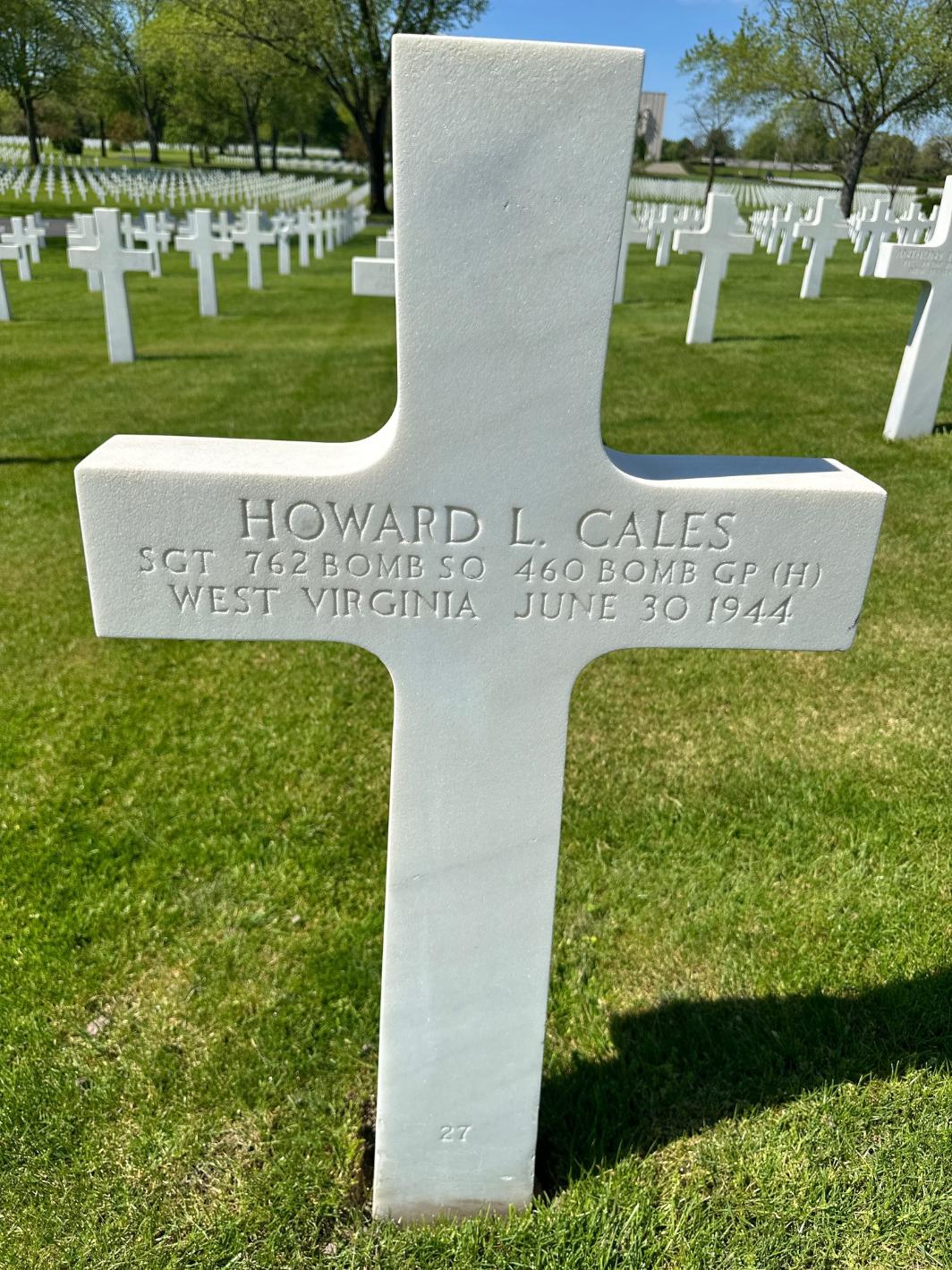Howard L. Cales was born on June 28, 1925, in Summers County, West Virginia. He was the son of Charles L. Cales and Minnie Dillon Cales. He served in the 762nd Bomber Squadron, 460th Bomber Group, Heavy, as a Sergeant and Gunner of B-24 #42-78258 during World War II.