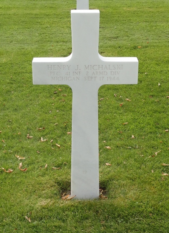 Henry J. Michalski entered military service in Michigan. He served in the 41st Armored Infantry Regiment, 2nd Armored Division, as a Private First Class during World War II. He died on September 17, 1944, and is now buried in the Henri-Chapelle American Cemetery, Hombourg, Belgium. PFC Michalski was one of the 65 soldiers killed in battle during the liberation of the Limburg region of the Netherlands and Belgium.