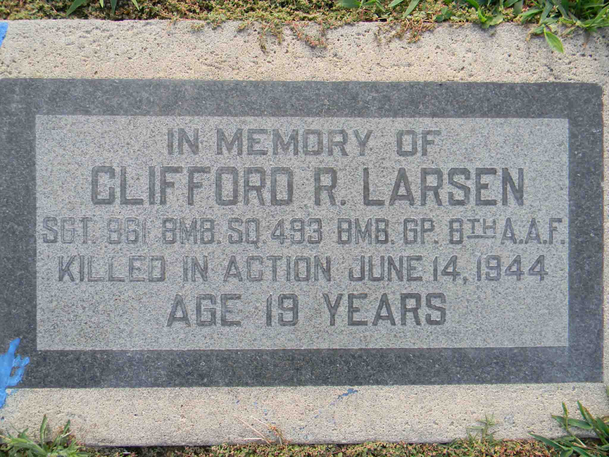 Clifford R. Larsen was born in 1925. He served in the 861st Bomber Squadron, 493rd Bomber Group, Heavy, as a Sergeant and Gunner during World War II. On June 14, 1944, his crew took off from Debach on an operational mission to Laon Airfield, France. On return at 9945 hrs, their aircraft spun in and crashed at Foxboro Hall Farm, Melton, Suffolk, while attempting an emergency landing. Their aircraft was returning from operations in Chievres with one engine out. All crew members were killed in the crash.