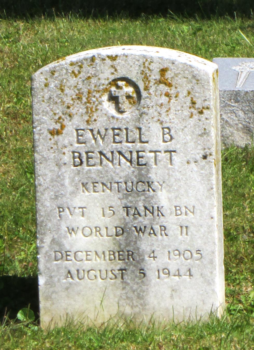 Ewell Bates Bennett was born on December 4, 1905, in Oldham County, Kentucky. He was the son of William Thomas Bennett and Sallie M. Bennett. He enlisted on 7 April 1942 at Fort Knox, Kentucky. He had been living in Louisville and working as a concrete finisher.