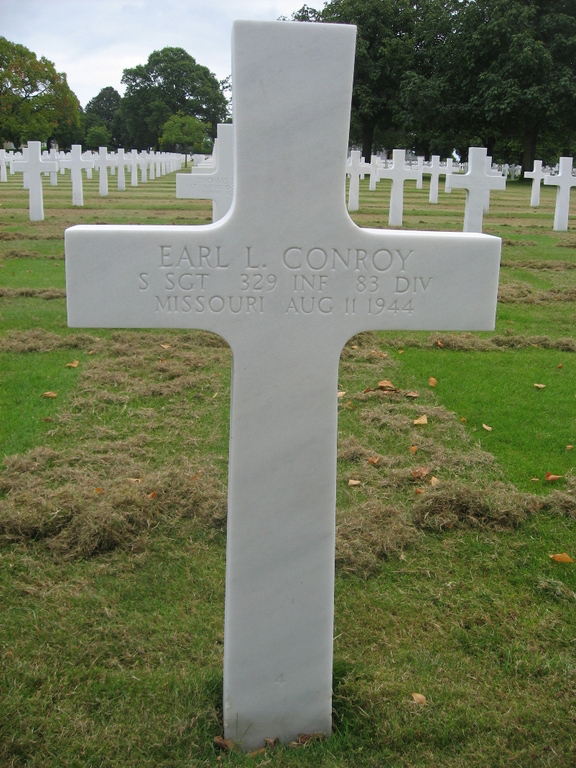Earl L. Conroy served in Company K, 329th Infantry Regiment, 83rd Infantry Division, as a Staff Sergeant during World War II. He was Killed in Action on August 11, 1944, during the Liberation of Saint-Malo in France. SSgt. Conroy was buried at Brittany American Cemetery and Memorial, Saint-James, Departement de la Manche, Basse-Normandie, France, and was awarded the Purple Heart.