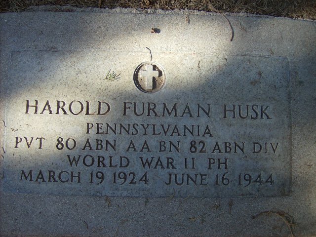 Harold Furman Husk was born on March 19, 1924, in Waynesburg, Greene County, Pennsylvania. He served in Battery C, 80th Airborne Anti-Aircraft Battalion, 82nd Airborne Division, as a Private during World War II. Pvt Husk was Killed in Action on June 16, 1944, during the liberation of Saint-Sauveur-le-Vicomte in France. He is now buried in the Hillside Memorial Park, Redlands, San Bernardino County, California. Pvt Husk was posthumously awarded the Purple Heart in recognition of his bravery and sacrifices.