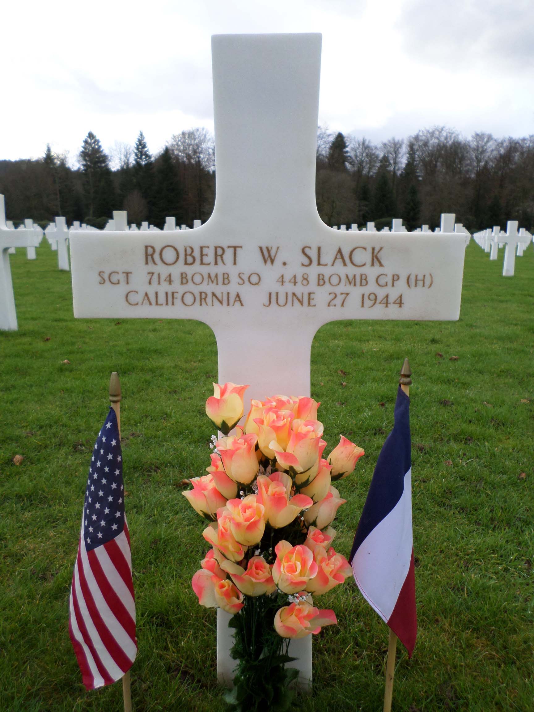 Sgt Slack was Killed in Action after being hit by ground fire while descending by parachute. He is now buried in the Epinal American Cemetery and Memorial, Epinal, Departement des Vosges, Lorraine, France.