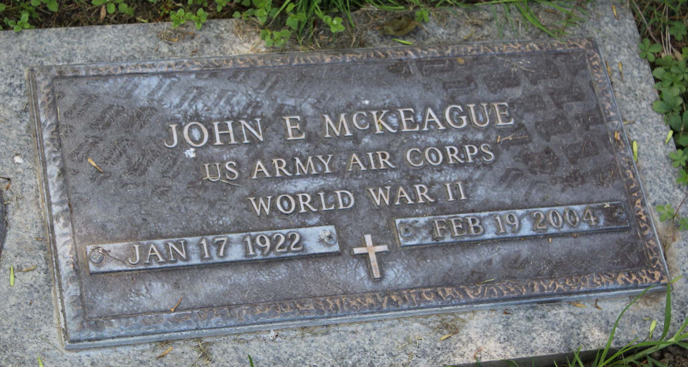 John Edward McKeague was born on January 17, 1922. He was married to Lahoma Joann Yates McKeague. He served in the 716th Bomber Squadron, 449th Bomber Group, as a Staff Sergeant and Tail Gunner of B-24J #42-64462 nicknamed “Stinky the B.T.O.” during World War II.
