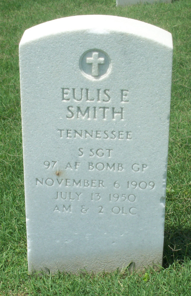 SSgt Smith was taken as a prisoner of war and held at Stalag 17B in Braunau Gneikendorf. After being freed, he returned to duty with the 342nd Bomb Squadron, 97th Bomb Group. He was Killed in Action on July 13, 1950, when his aircraft, B-50D Superfortress (#49-267) from Biggs Field, Texas, crashed near Mason, Ohio, killing all 16 crew members. The bomber carried a nuclear bomb without a fuel cell, which exploded on impact, leaving a massive crater. No distress call was received, and conflicting reports of weather and an engine fire left the cause a mystery. He is now buried in the Chattanooga National Cemetery, Chattanooga, Hamilton County, Tennessee, USA.