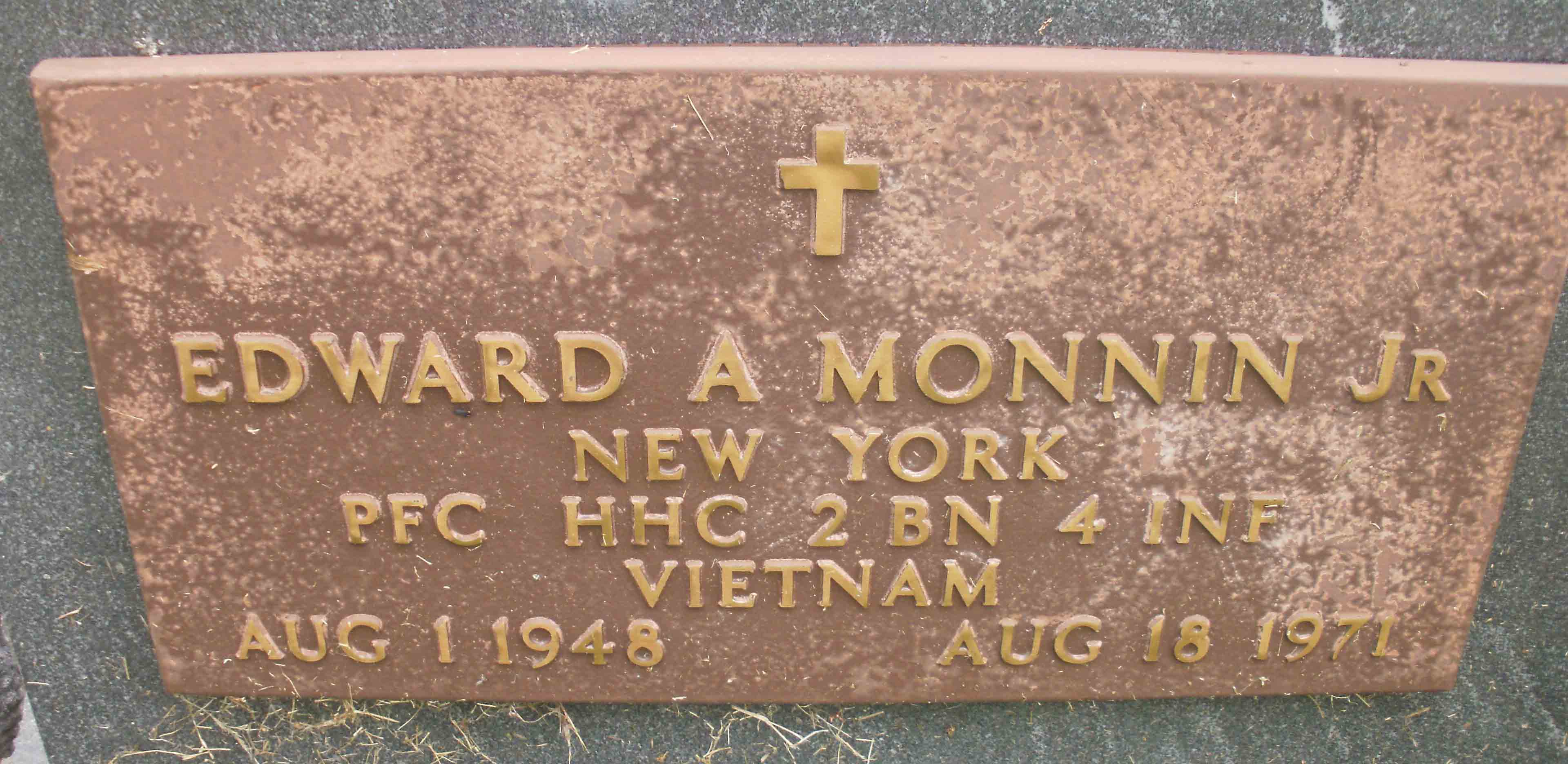 Edward A. Monnin Jr. was born on August 1, 1948, in Buffalo, New York. He was the son of Edward A. Monnin Sr. and Irene M. Sullivan Monnin. He was the husband of Kathy Monnin. He graduated from Bishop Ryan High School in 1966. He served in the Heavy Mortar Platoon, Headquarters and Headquarters Company, 2nd Battalion, 4th Infantry Regiment, as a Private First Class and Mortarman during the Vietnam War era.