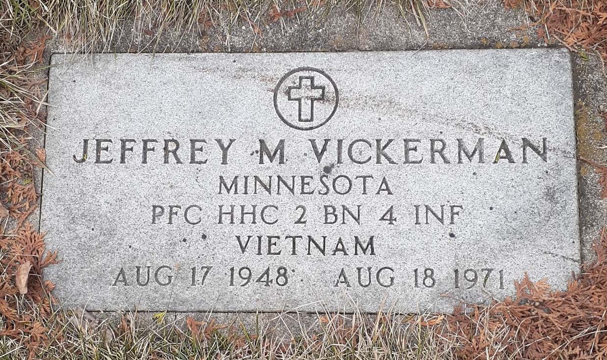 Jeffrey Mathias Vickerman was born on August 17, 1948, in Hennepin County, Minnesota. He was the son of Glenard Leroy Vickerman Jr. and Rose Mary Emma Barthel Vickerman. He was a graduate of St. Cloud State College and was drafted in October 1947 and sent to Germany at the end of March. He served in the Heavy Mortar Platoon, Headquarters and Headquarters Company, 2nd Battalion, 4th Infantry Regiment, as a Private First Class and Mortarman during the Vietnam War era.