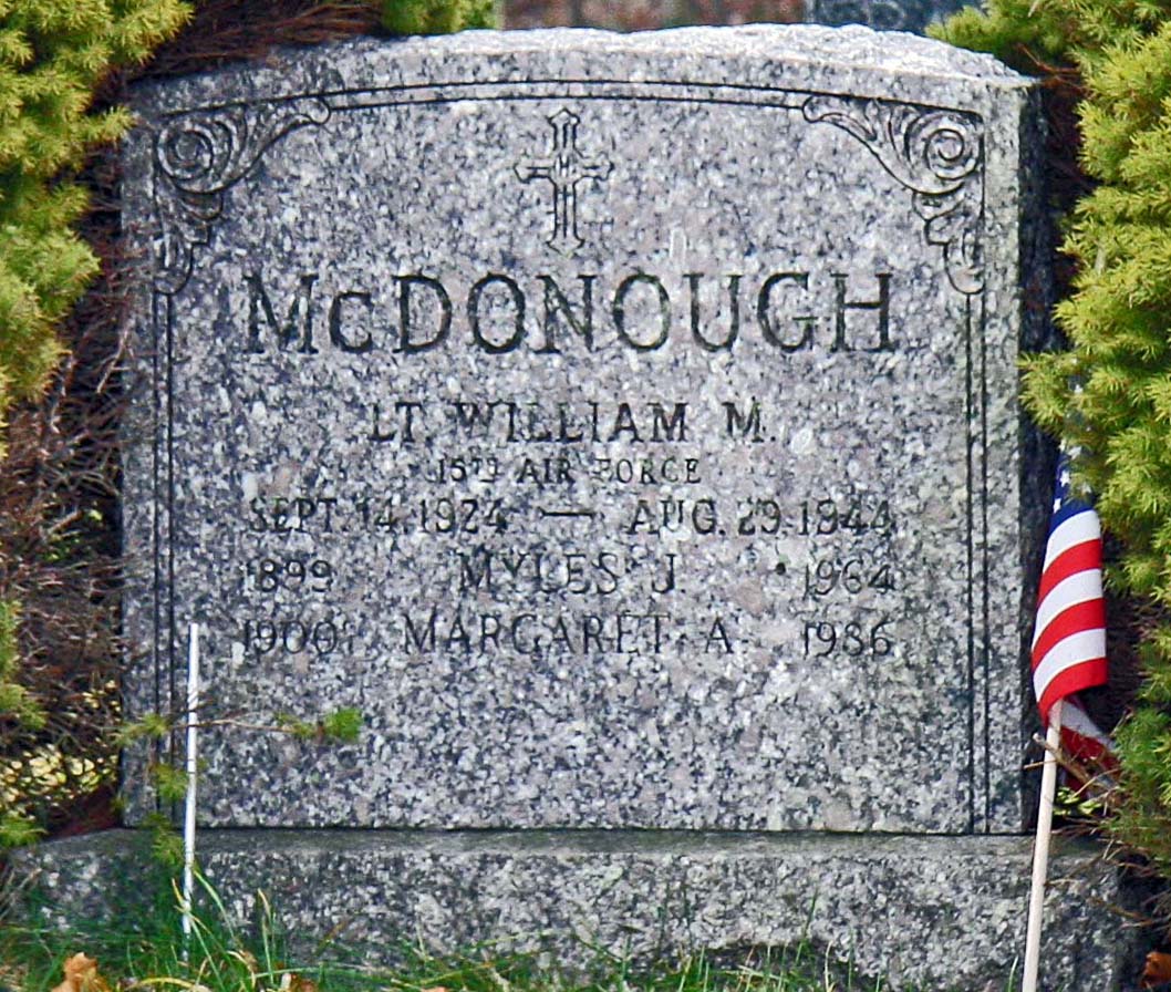 2Lt McDonough was one of the 28 U.S. airmen laid to rest in a mass grave at Slavicin, Czechoslovakia, before being exhumed and reinterred at Saint Francis Xavier Cemetery, Weymouth, Norfolk County, Massachusetts, USA.