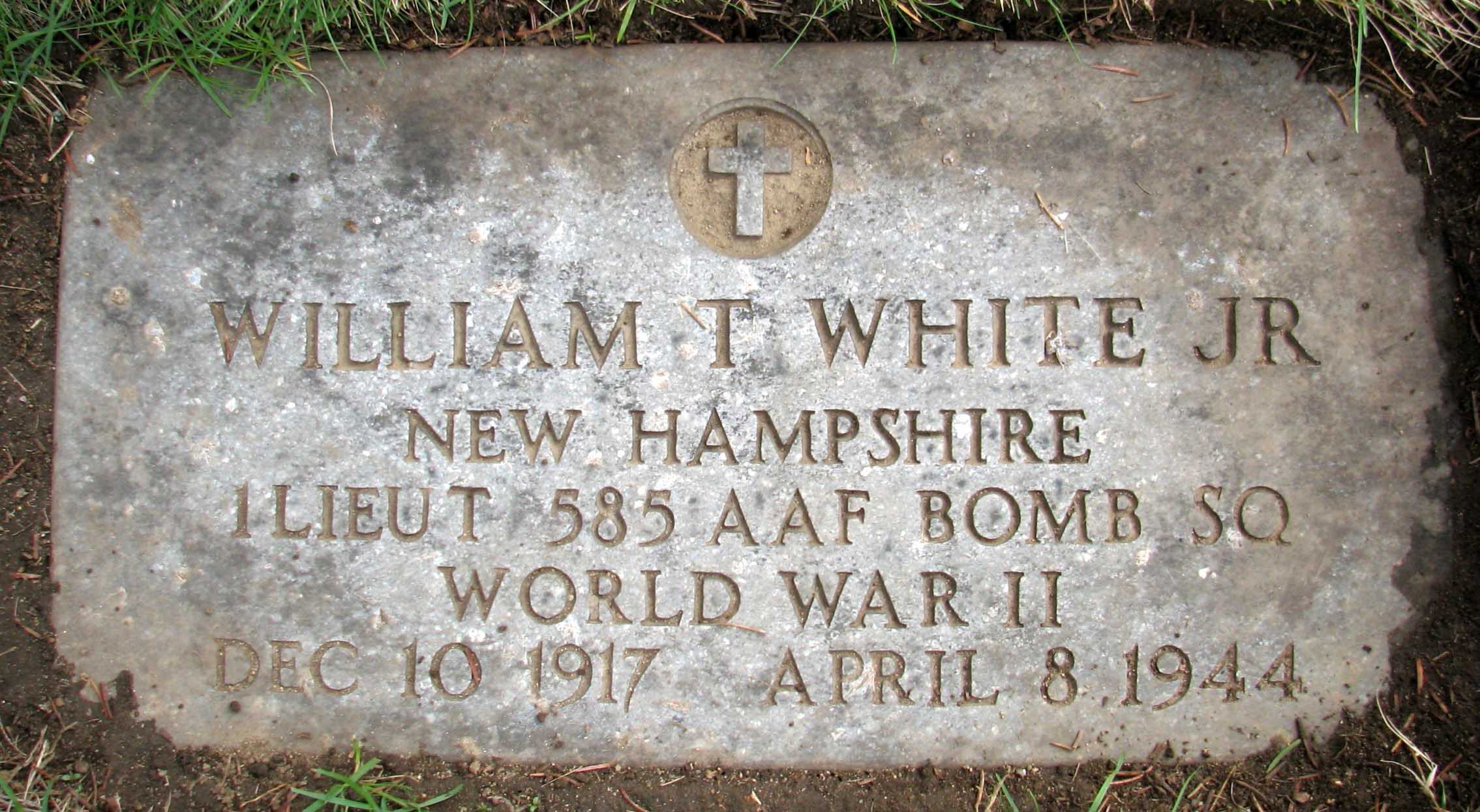 William T. White Jr. was born on December 10, 1917, in Manchester, Hillsborough County, New Hampshire. He was the son of William T. White Sr. and Anna F. Leahy White. He worked as a salesman before enlisting in the service on December 30, 1941. He served in the 585th Bomb Squadron, 394th Bomber Group, as a First Lieutenant and Pilot of B-26 #42-96032 during World War II.