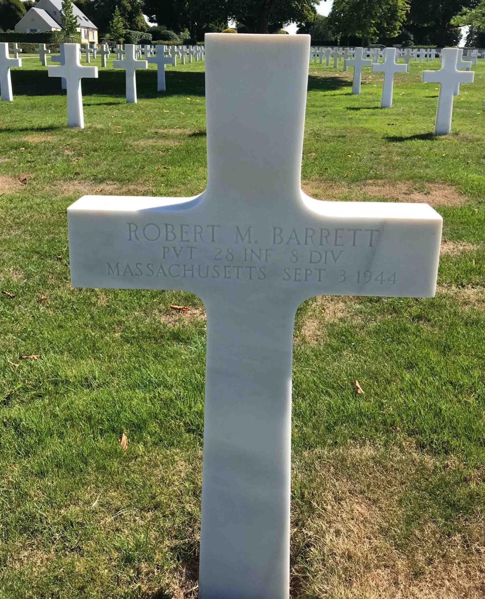 Pvt Barrett was Killed in Action on September 3, 1944, during the Battle of Brest, France. He is now buried in the Brittany American Cemetery and Memorial, Saint-James, Département de la Manche, Basse-Normandie, France.