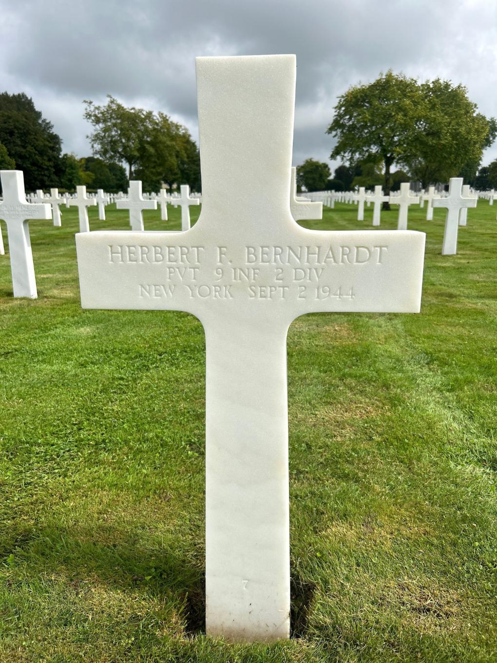 Pvt Bernhardt was Killed in Action on September 2, 1944, during the Battle of Brest, France. He is now buried in the Brittany American Cemetery and Memorial, Saint-James, Département de la Manche, Basse-Normandie, France.