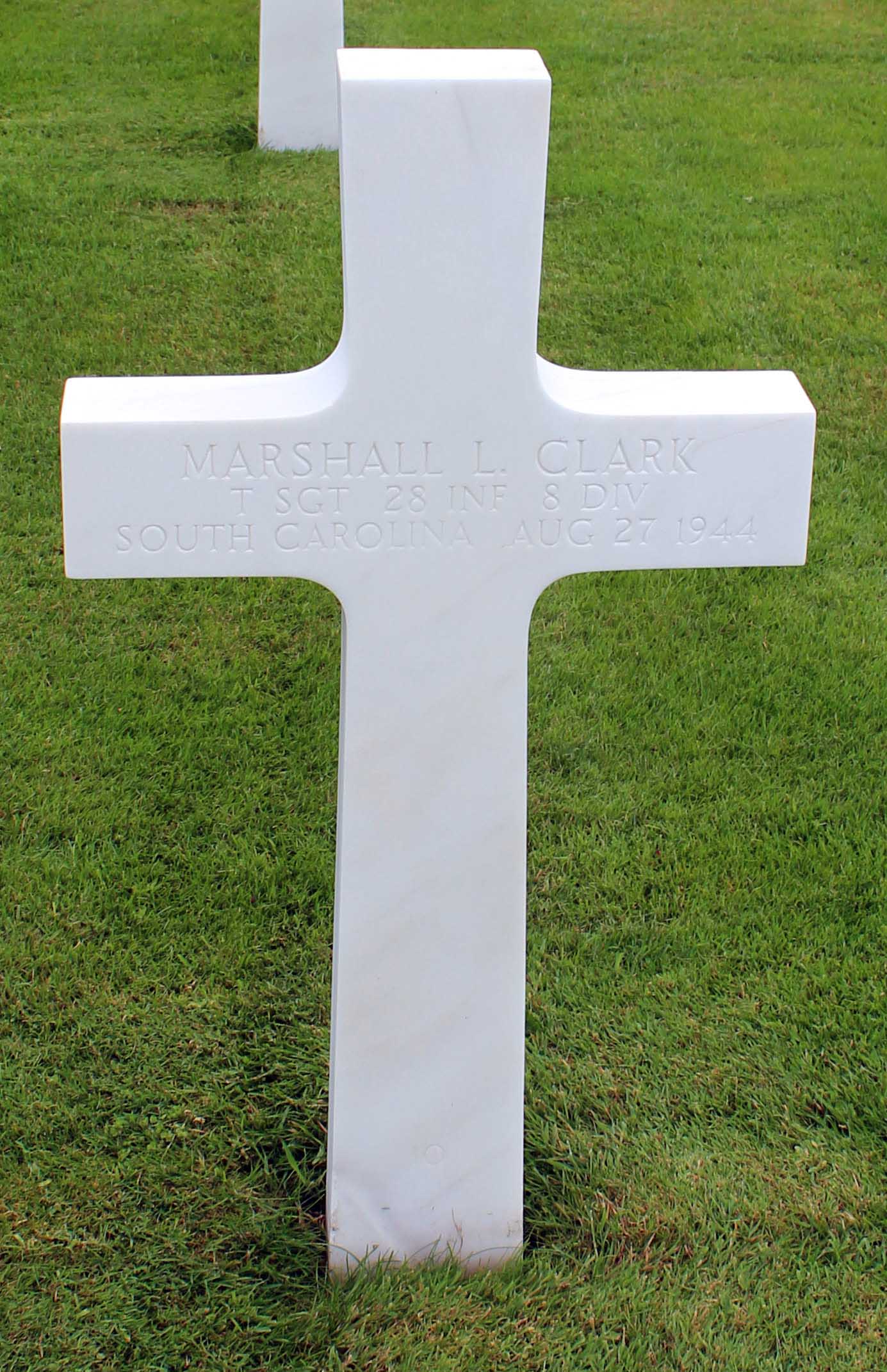 TSgt Clark was Killed in Action on August 27, 1944, during the Battle of Brest, France. He is now buried in the Brittany American Cemetery and Memorial, Saint-James, Département de la Manche, Basse-Normandie, France. He also has a cenotaph in the Salem Cemetery, Abbeville County, South Carolina, USA.