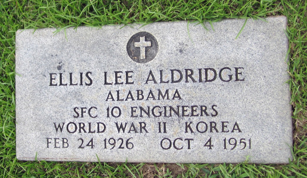 Ellis Lee Aldridge was born on February 24, 1926, in Fayette County, Alabama. He was the son of Marion Claude Aldridge and Louvenia Elizabeth Canterbury Aldridge. He was married to Robbie Hope Miles Aldridge. He served in the Headquarters and Service Company, 10th Engineer Combat Battalion, 3rd Infantry Division, as a Sergeant First Class and Combat Construction Foreman during the Korean War.