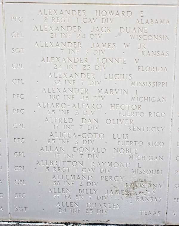 PFC Alexander was listed as Missing in Action while fighting the enemy near Unsan, North Korea, on November 2, 1950. He was presumed dead on December 31, 1953. His remains were not recovered. His name is inscribed on the Courts of the Missing at the Honolulu Memorial.